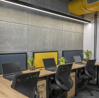 The interiors were designed to reflect the brands vision and sustainability goals. Keeping it minimal we used exposed cement boards for partitions, exposed steel structure, kota stone flooring. The ducts were painted yellow (obviously!) to highlight the company's business of IAQ.
