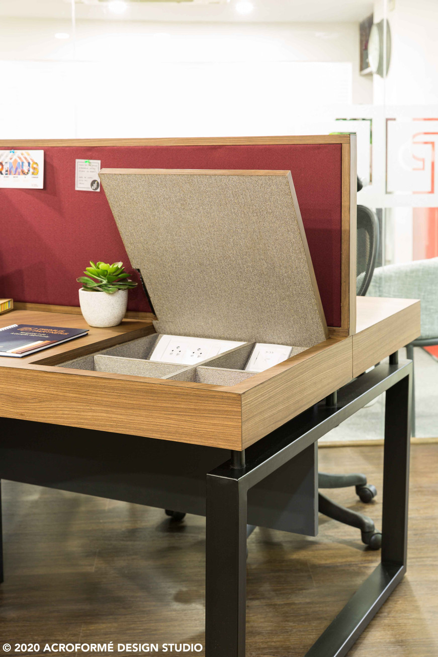 For the Managers Cabin, we needed to seat the 4 main people, along with a discussion area for any informal meetings they would like. For this we customized an island seating with storage spaces, wire concealers and of-course lockable drawers for those important papers. The flushed concealed wire manager, doubles up as a stationery storage too, compartmentalized for ease of use.
